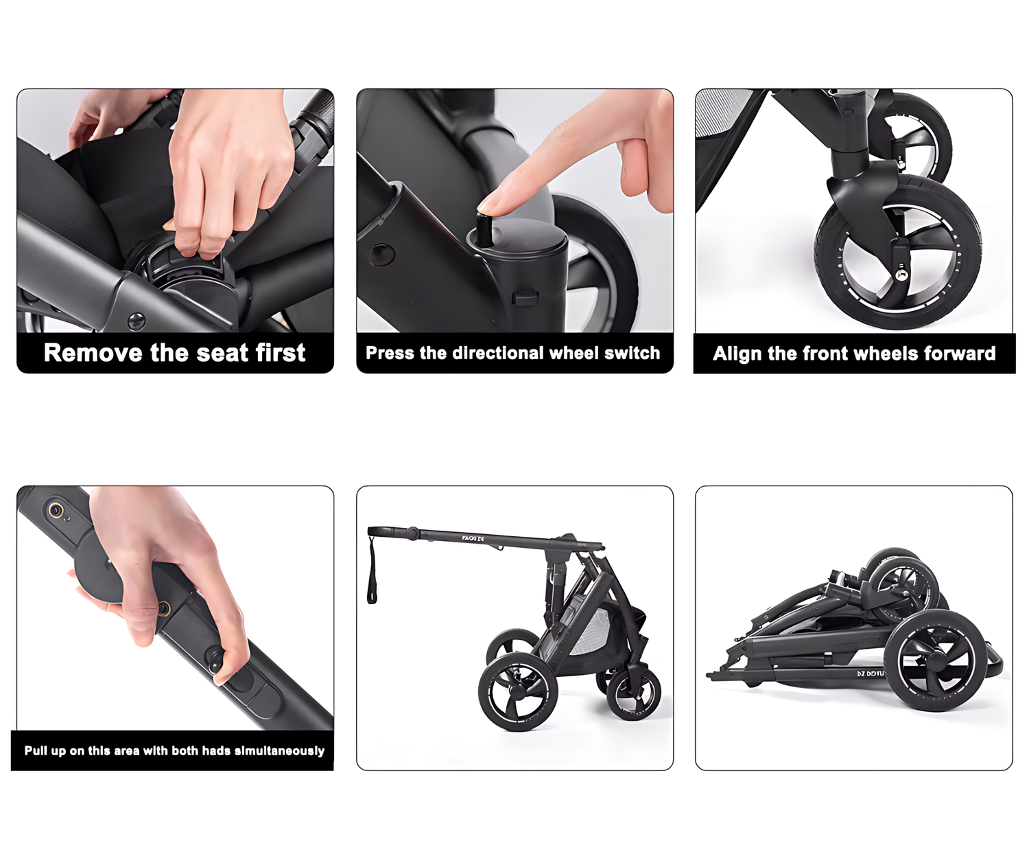 Helppo, yksivaiheinen taittomekanismi. Irrota istuin, suuntaa etupyörät ja vedä liipaisimista, jotta runko taittuu kokoon pieneen kokoon.