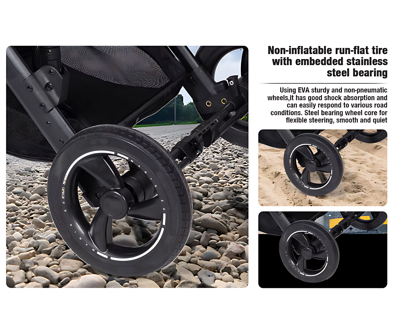 Puhkeamattomat, umpikumiset renkaat, joissa sisäänrakennetut teräslaakerit. Kestävä EVA-materiaali takaa tasaisen, hiljaisen ajon ja joustavan ohjauksen.